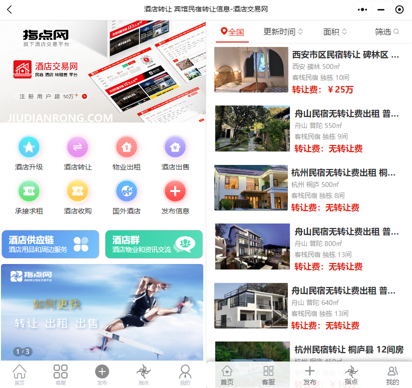 指點(diǎn)網(wǎng):國(guó)內(nèi)最大的酒店轉(zhuǎn)讓平臺(tái),酒店行業(yè)注冊(cè)用戶超過 50 萬(wàn),每月訪問量超過 20 萬(wàn)人次。平臺(tái)覆蓋國(guó)內(nèi)所有酒店品牌方,還涵蓋國(guó)外酒店出售轉(zhuǎn)讓和物業(yè)招租信息,為酒店投資人和品牌開發(fā)人員提供了豐富選擇,且不收傭金