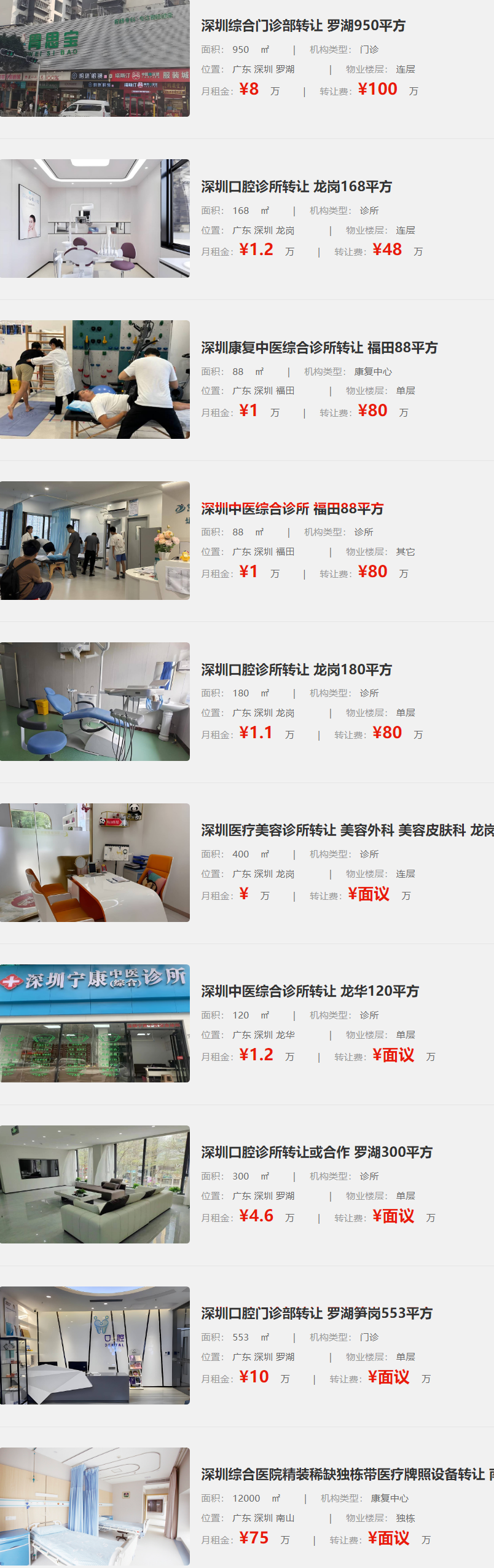 在當今充滿機遇與挑戰(zhàn)的醫(yī)療市場中,民營醫(yī)院、門診、診所、醫(yī)藥企業(yè)以及醫(yī)療美容機構的轉(zhuǎn)讓交易日益頻繁。而深圳指點網(wǎng),作為專業(yè)的商業(yè)地產(chǎn)招商出租出售交易平臺,憑借其獨特的優(yōu)勢,為各類民營醫(yī)療相關機構的轉(zhuǎn)讓提供了全方位、高效能的服務,同時依托深圳特區(qū)的政策優(yōu)勢,助力醫(yī)療行業(yè)的資源優(yōu)化與整合。