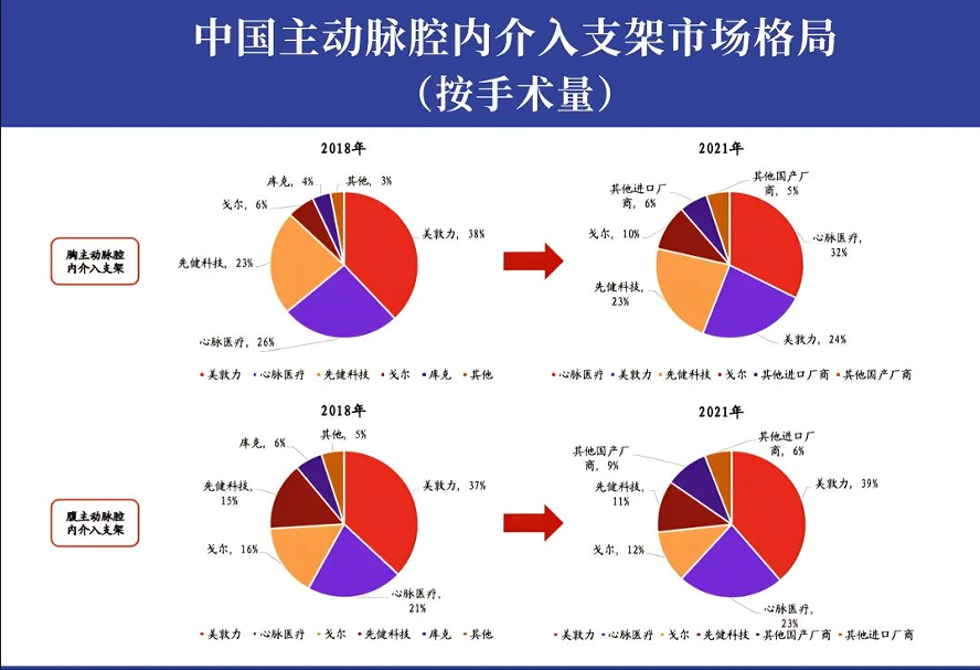 從市場(chǎng)占有率看,根據(jù)興業(yè)證券研究報(bào)告,2018年美敦力在中國(guó)胸主動(dòng)脈腔內(nèi)介入支架市場(chǎng)占38%份額,位列第一。兩家國(guó)產(chǎn)廠商心脈醫(yī)療和先健科技,分別占據(jù)26%、23%。