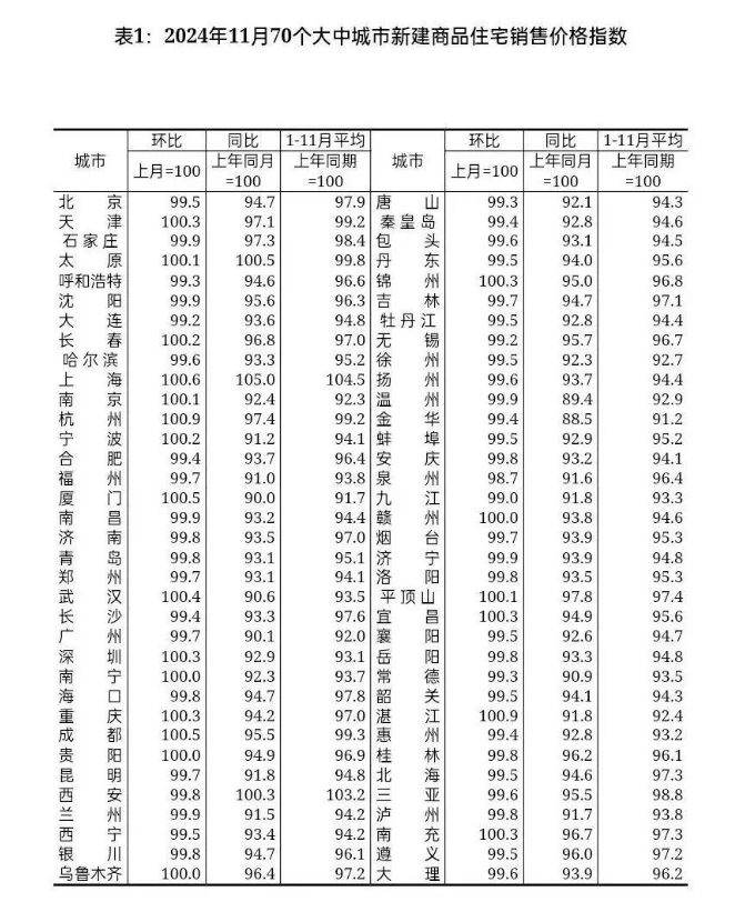 2024 年 12 月 16 日,國家統(tǒng)計(jì)局公布了 11 月份 70 個(gè)大中城市商品住宅銷售價(jià)格情況,以下是重點(diǎn)歸納: