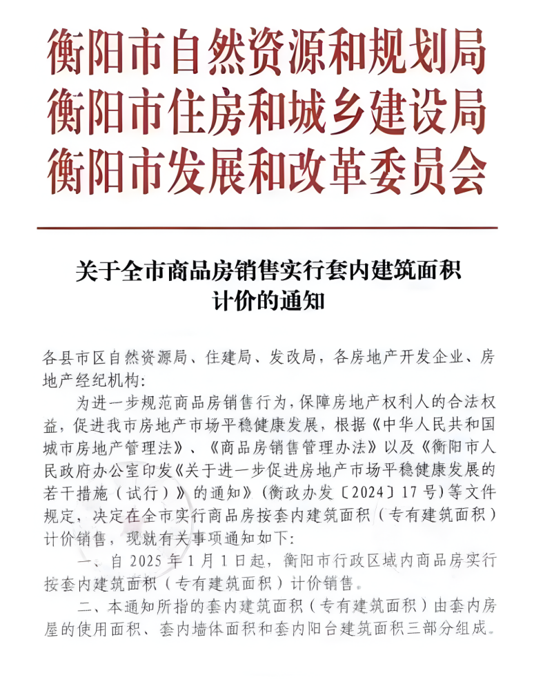 衡陽(yáng)市:12 月 12 日,衡陽(yáng)市自然資源和規(guī)劃局、住房和城鄉(xiāng)建設(shè)局、發(fā)展和改革委員會(huì)聯(lián)合發(fā)布通知,明確自 2025 年 1 月 1 日起,衡陽(yáng)市商品房銷售實(shí)行套內(nèi)建筑面積計(jì)價(jià)。