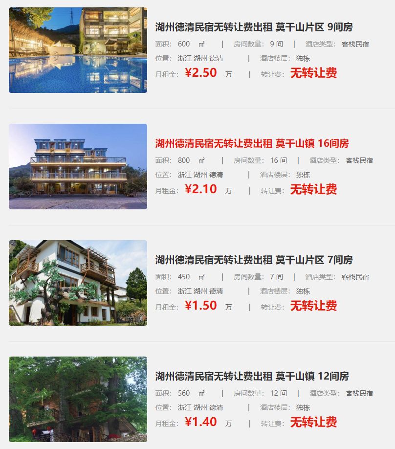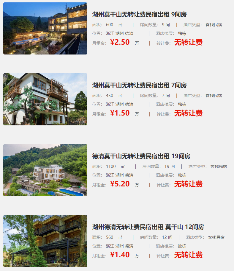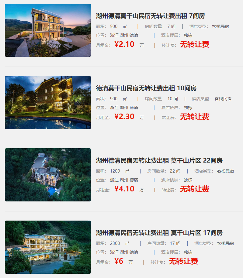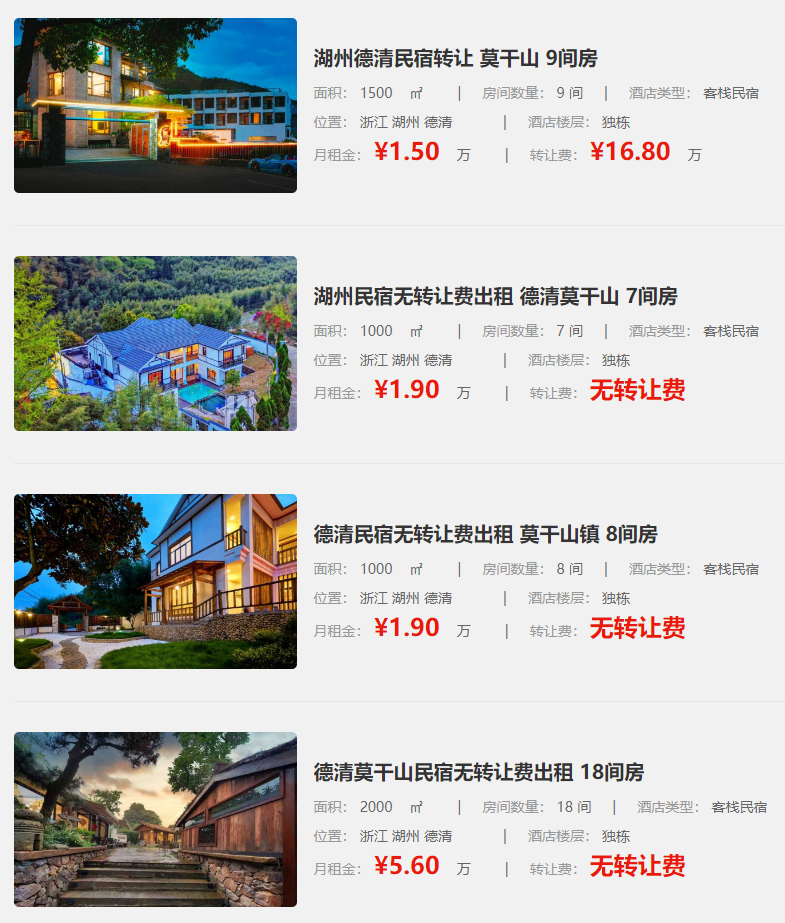 漫步在莫干山的一些村落,曾經(jīng)那些獨具特色、充滿文藝氣息的民宿招牌旁,如今卻多出了許多 “轉(zhuǎn)讓” 的字樣。據(jù) [指點網(wǎng)] 的數(shù)據(jù)顯示,近期莫干山民宿轉(zhuǎn)讓的數(shù)量驚人。這些民宿,有的剛剛開業(yè)不久,有的則已經(jīng)經(jīng)營了數(shù)年,大量無轉(zhuǎn)讓費的。但如今它們的老板們都面臨著相同的難題。