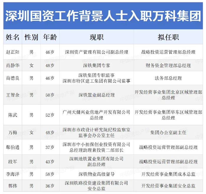 同一天早些時(shí)候,萬科還在內(nèi)部宣布了多位高管的人事任命。這些新任命的人員,全部來自深圳國(guó)資系統(tǒng),涉及集團(tuán)總部多個(gè)核心部門,以及北京、華東等開發(fā)經(jīng)營(yíng)本部。比如,趙正陽擬任戰(zhàn)略投資運(yùn)營(yíng)管理部總經(jīng)理,王智余擬任北京區(qū)域管理部總經(jīng)理,陳武擬任華東區(qū)域管理部總經(jīng)理。