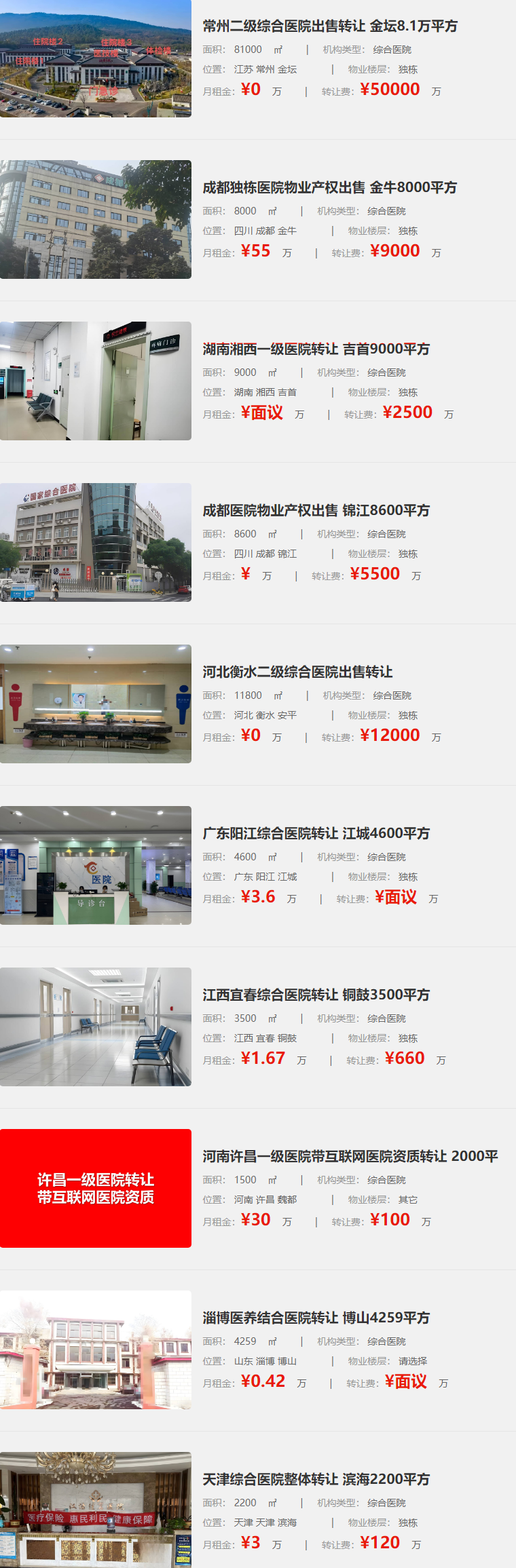 醫(yī)院轉(zhuǎn)讓:涵蓋全國各地一級至三級醫(yī)院的轉(zhuǎn)讓信息,包括綜合醫(yī)院、??漆t(yī)院、中醫(yī)醫(yī)院等不同類型的醫(yī)院。無論您是想投資大型綜合性醫(yī)院,還是專注于某一??祁I(lǐng)域的醫(yī)院,都能在指點網(wǎng)找到合適的項目。